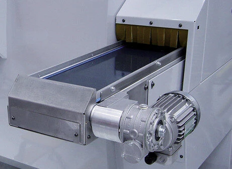 The finished-part pick-up device places the parts on an accumulating conveyer. The conveyer is timed to prevent the parts, some of which are very complex, from falling on top of each other.