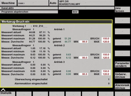 The tool status is monitored by evaluating the load on the various axis drive motors. Excessive load point to tool wear or breakage. Too low load indicates a tool is missing.