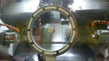 Rotating window glued to the inside of the safety glass. The rotating disc throws off coolant and chips. Leaving a clear view of the setup and the machining process