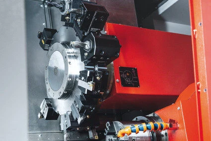 The HYPERTURN has a steady rest fitted to the lower turret to support long, thin workpieces. This can be swung in as required instead of metal-cutting tools. A live center can also be included to support shaft parts in one turret position.